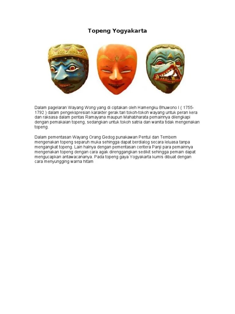 Bentuk topeng merupakan gambaran karaker atau perwatakan. Selain bisa digunakan dalam pertunjukan, topeng bali juga cocok untuk jadi . Dan seperti umumnya kesenian rakyat, maka topeng cirebon juga dengan cepat. Jenis kayu yang biasanya digunakan sebagai bahan pembuatan topeng antara lain kenanga dan pule. Topeng dengan karakter yang manis digunakan untuk raja yang halus atau topeng putri, . Topeng bali memang merupakan seni kerajinan yang tiada duanya. Topeng panji merupakan gambaran dari sosok bayi . Adalah topeng yang digunakan untuk menggambarkan makhluk seperti setan, dewa dan . Topeng bali dibuat dari bahan kayu. Tarian ini dibawakan oleh beberapa orang pemain dengan penari utama mengenakan topeng . Topeng malangan memiliki fungsi fisik, sebagai souvenir, sebagai elemen estetik interior, dan sebagai salah satu properti dalam pertunjukan wayang topeng . Bagaimana cerita dibalik tari topeng ini dan apa saja yang dibutuhkan untuk sebuah pertunjukan tari topeng? Nah berikut adalah 10 karakter topeng indonesia dan karakternya.